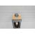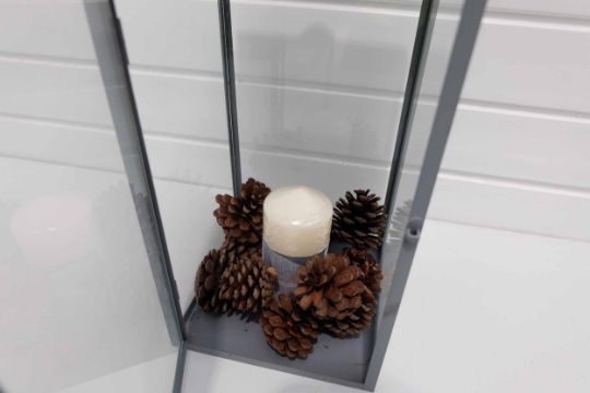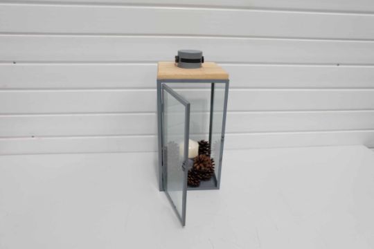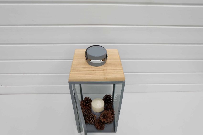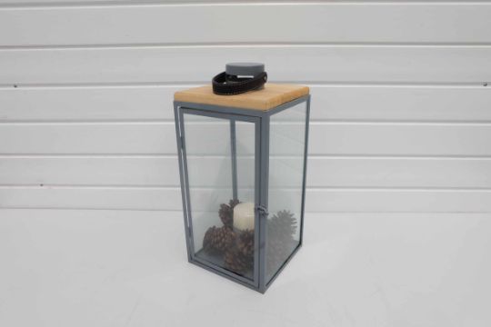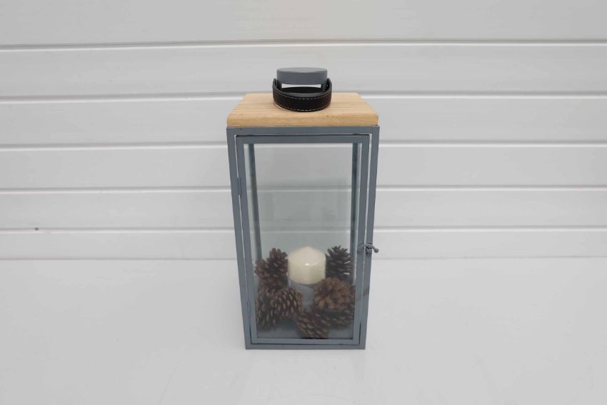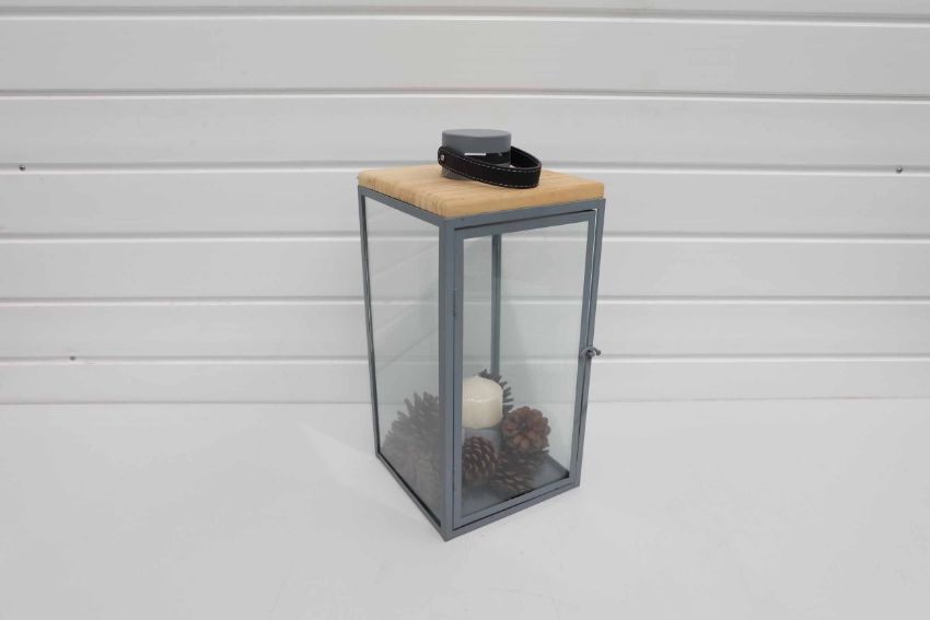 Grey Lantern Candle Holder With Leather Handle and Wooden Top.