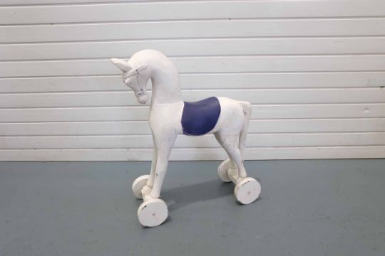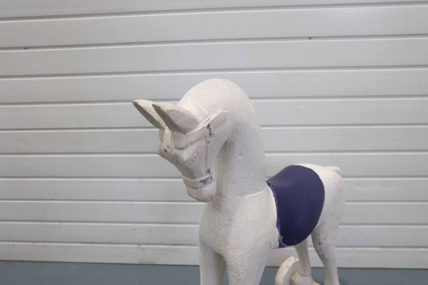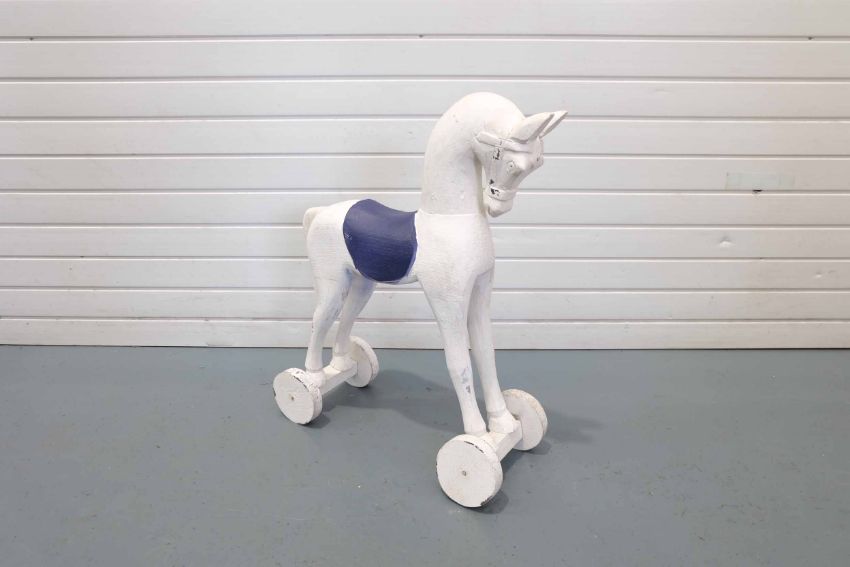 Ornamental Wooden Horse on Wheels With Painted Blue Saddle.