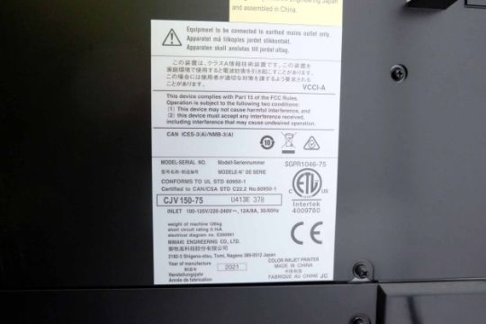 MIMAKI CJV150-75 Inkjet Printer / Cutter. Silver Ink Compatible. On-demand Piezo Printhead. Print Resolution 360 up to 1440 dpi. Max Print/Cut Width 800mm. Media Thickness 1.0mm or Less.
