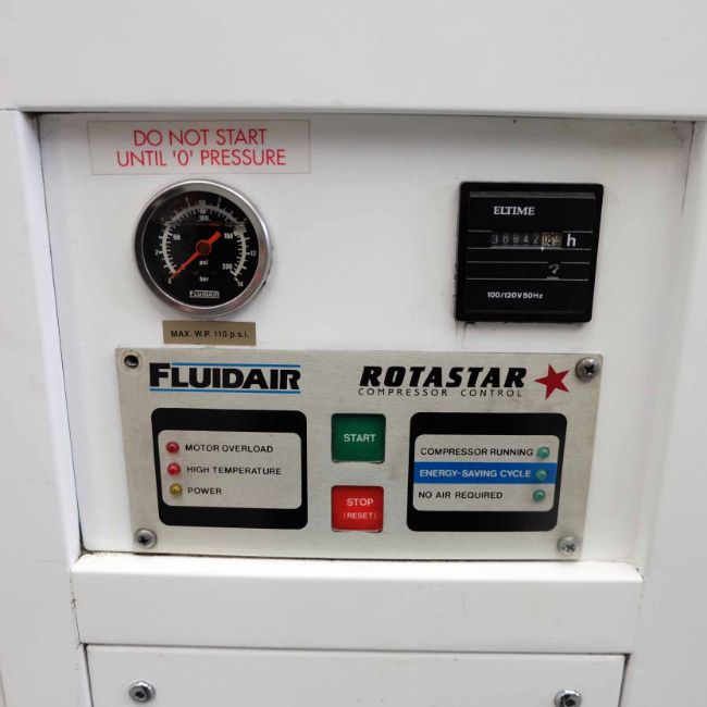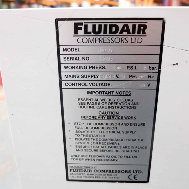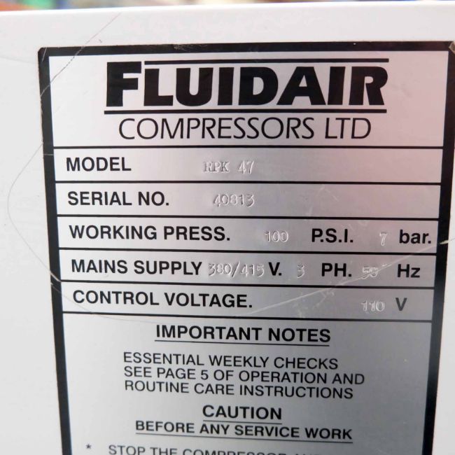 Fluidair Model RPK47 Rotary Air Compressor. Working Pressure 100PSI. 7 Bar. 415V. 3 Phase. Control Voltage 110V. Hours 38,942.