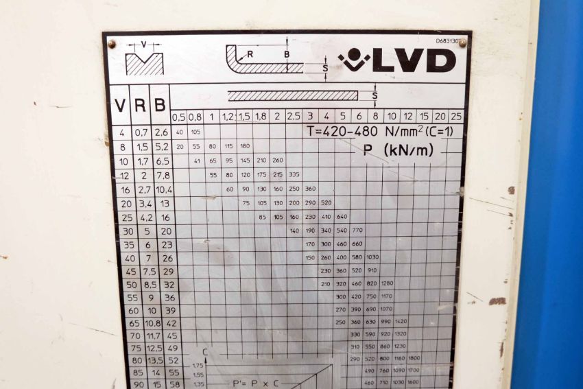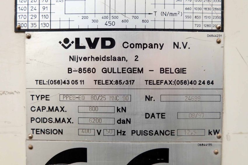 LVD Type PPEB-EQ 80/25 MNC 90 Hydraulic Power Press Brake. Capacity 80 Ton x 2500mm. MNC 90 Colour Graphic Control With 6 Axis Back Gauge. Full Lengths of Top & Bottom Tools. Sick 14-FGS Light Guards. Motor Power 12.5kw. Year of Manufacture 1997.