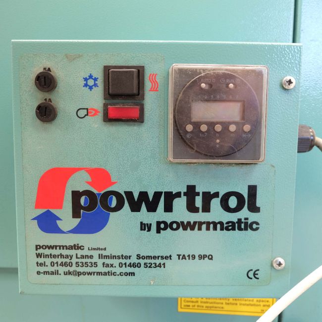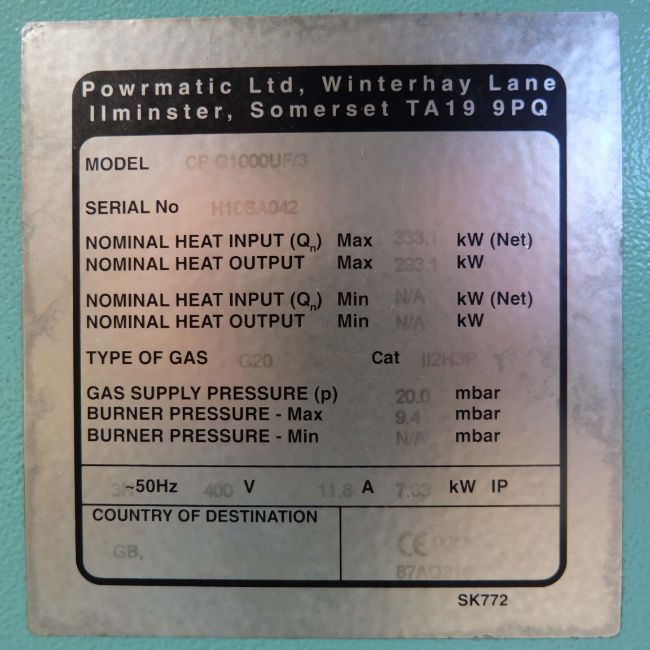 Powermatic Model CP G1000UF/3 Warm Air Cabinet Heater. Nominal Heat Output 293KW Max. Type of GCS: G20. Year 2004. Motor 3 Phase 400V. 11-8 Amp. 7.63KW.