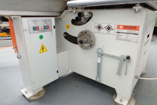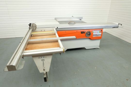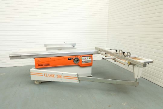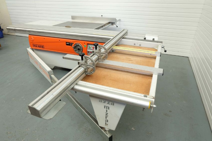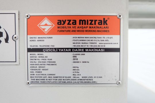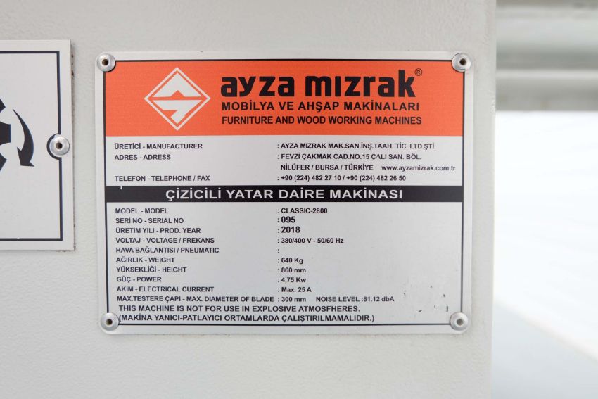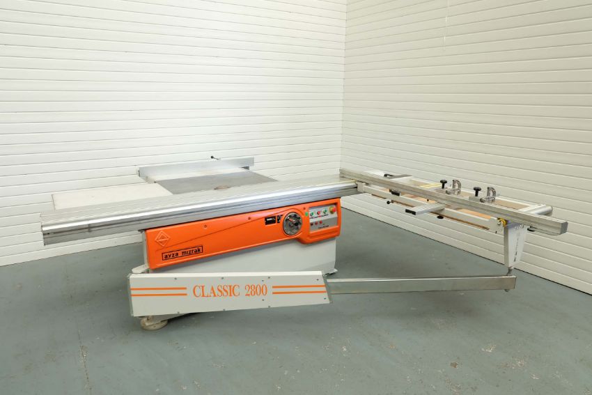 Ayza Mizrak Model Classic 2800 Reclining and Sliding Circular Saw Bench. Aluminium Slide Length 2800mm. Standard Saw Diameter 300mm. Max Cutting Height 78mm and at 450 Degrees 55mm. Max Cutting Width 1300mm. 3 Phase Motor, 4.75 kW. Year 2018