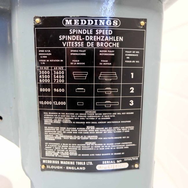 Meddings 13760/M10 High Speed Drill. Spindle Speeds 3000 - 6000. 7" Diameter Adjustable Table. Single Phase Motor.