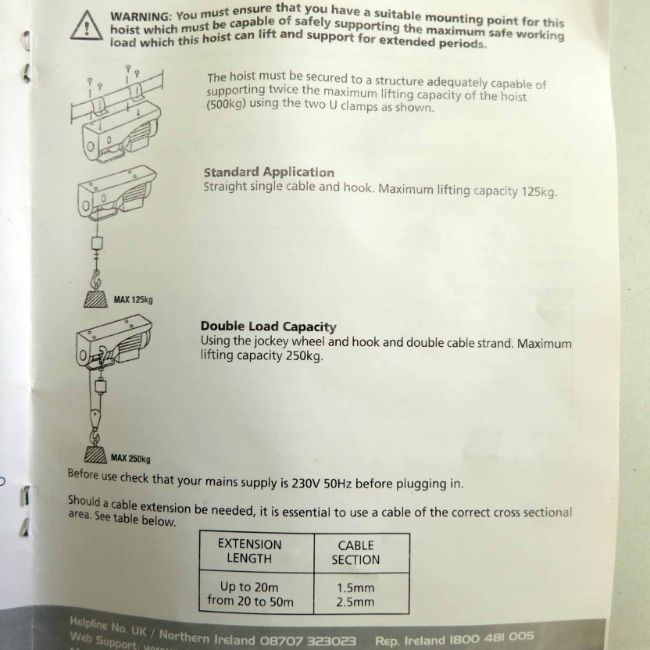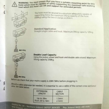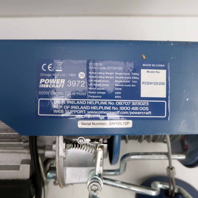 Power Craft PCEH 125/250 550W Electric Cable Hoist. Lifting Capacity 125kg - 250kg. 240V.